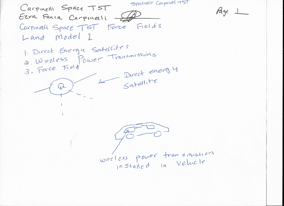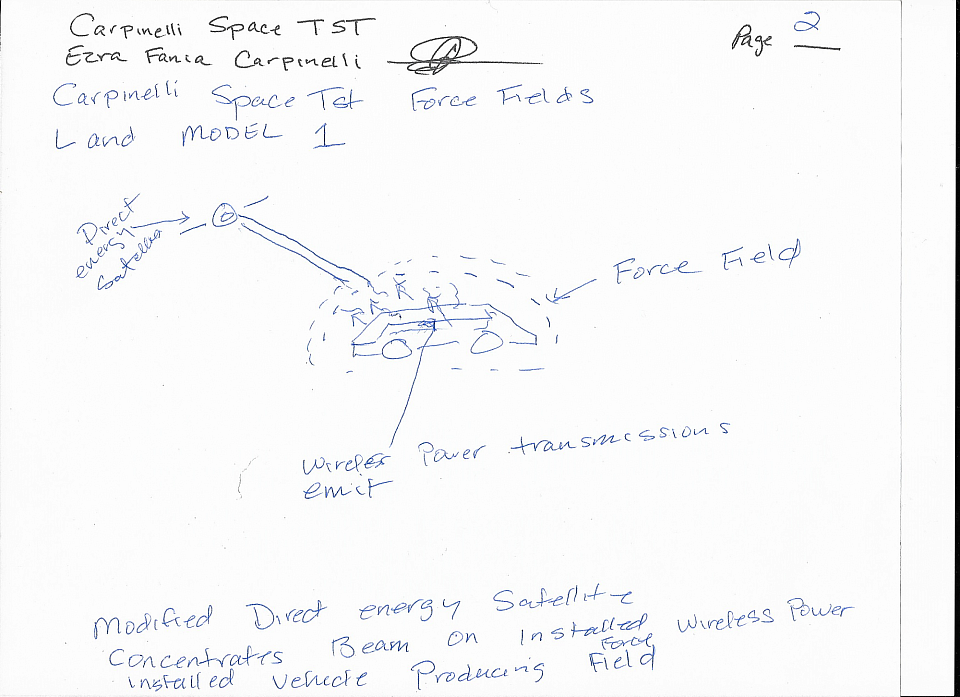 (Page 1) Modified Direct Energy Satellite in Orbit in position to initiate force field sync with wireless power transmission installed vehicle. The direct energy satellite and vehicle would produce t positive charges (like charges) producing repulsion fields.